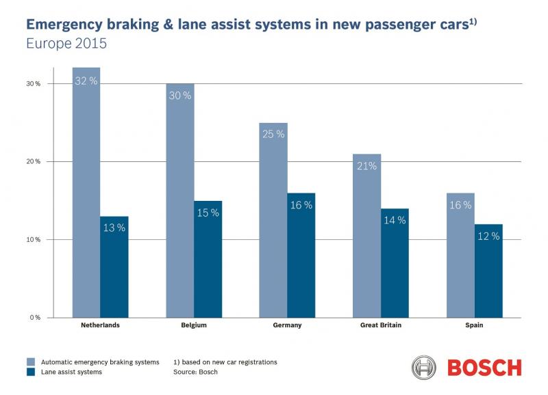 A Bosch elemzése szerint a követési távolságot is figyelő adaptív sebességszabályozó (ACC) is nagy népszerűségnek örvend az autóvásárlók körében: ez a vezetéstámogató „asszisztens” a 2015-ös évben az új német személyautók 11 százalékában volt megtalálható. A parkolási vezetéstámogató rendszerek (az egyszerű távolságmérő szenzoroktól a kormányzás feladatát elvégző parkolóasszisztensekig) minden második Németországban újonnan forgalomba helyezett személyautóban könnyítik meg a manőverezést. Az új személyautók 16 százaléka felügyeli a sávváltást vagy tartja önállóan a választott forgalmi sávot, míg az új autók 11 százalékába integráltak a közlekedési táblákat kamera segítségével felismerő rendszert.