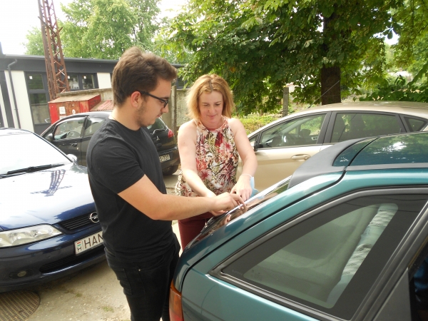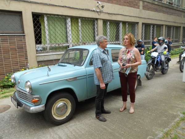 Még indulás előtt megszólaltattuk a veterán Moszkvicsot követő két, már bukósisakot viselő motoros diákot is. Farkas Olivér és Bagi Balázs osztálytársként a 4. évet fejezték be az autószerelő szakon, de maradnak még plusz egy évet az iskolában. (Írásunk első részét itt olvashatják.) Azt már Győri Sándor szakoktatótól tudtuk meg, hogy az érettségizők 90 százaléka a középiskolai tanulmányok során megszerzi a B kategóriás jogosítványt is és 70-80 százalékuk marad még egy évet tanulni. Köztük Komócsin Krisztián is, akinek indulás előtt maga az igazgatónő segített az utolsó pillanatban feltenni az autóra az iskola matricáját.