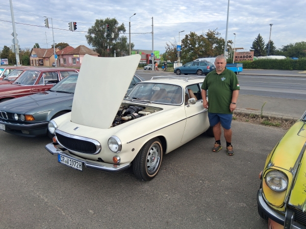 Portálunk szombaton, reggeli időben a hotelnél nézte meg alaposan az addigra indulásra felsorakozó autókat és motorokat. Ott elsőként Horváth Róbertbe botlottunk, aki erre a találkozóra egy kitűnő állapotú, 1972-es évjáratú Volvo P1800 ES kombival érkezett. – Ebben az autóban dolgozik a márka első elektromos befecskendezésű motorja, ami a Volvo a Bosch közös fejlesztése. Különleges még a külön nyitható, keret nélküli hátsó ablak, ami a csomagtér praktikusságát növeli – mondta a veteránautóról Róbert.
