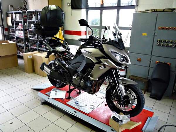 Átadás előtti szerelési munkák közben egy Kawasaki Versys 1000 - csak a négy leömlő és a méretes hátsó dob segít a kistesótól való megkülönböztetésben. A Zakar cégcsoport zászlaja alatt gyakran szerveznek motoros túrákat, melynek oroszlánrésze lehet az országos ismertségben