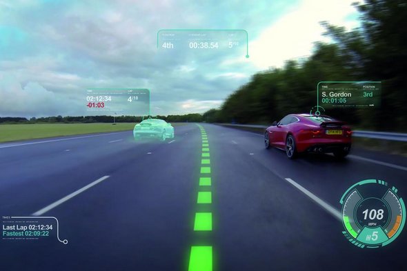 A Jaguar-Land Rover azt állítja, hogy a legújabb fejlesztése segíti a vezetőt a jobb köridők elérésében versenypályán, de a közúton is fejleszti a vezetési képességeket. A rendszer az egész szélvédőre képes ábrákat vetíteni, amelyek a vezető szemében úgy tűnnek, mintha az úton lennének.