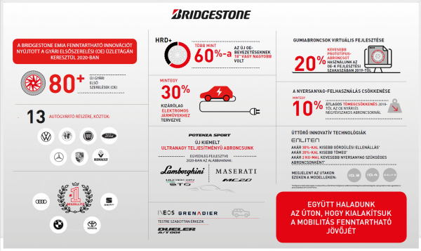 A mobilitás fenntartható jövőjének kialakítása a Bridgestone EMIA és annak OE-üzletága számára egyaránt a középpontban állt 2020-ban. Mivel a vállalat saját virtuális gumiabroncs-modellezési technológiája csökkenti a fizikai prototípus-abroncsok számát és a tesztelés során felhasznált nyersanyagok teljes mennyiségét, a forradalmian könnyű ENLITEN technológia először jelent meg az utakon a Volkswagen teljesen elektromos ID.3 típusával, és az év során a gyári elsőszereléseinek körülbelül 30 százalékát kizárólag elektromos járművekhez tervezték, 2020-ban a Bridgestone úttörő szerepet játszott a fenntartható innovációban mind a termelés, mind a termékek terén.