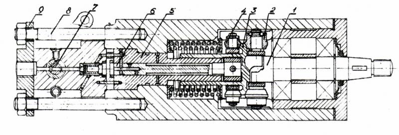 Az MK-1 adagolószivattyú szemléltető metszetrajza: 1. Hajtótengely, 2. Tolóerőmérleg, 3. Menesztőhüvely, 4. Rugóerőmérleg, 5. Elosztóhenger, 6. Forgóelosztós dugattyú, 7. Regulátor, 8. Leszorító csavar, 9. Leszorító kengyel