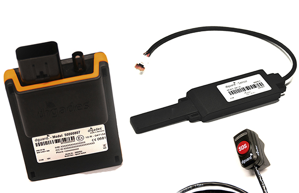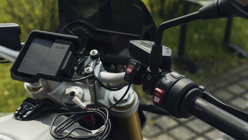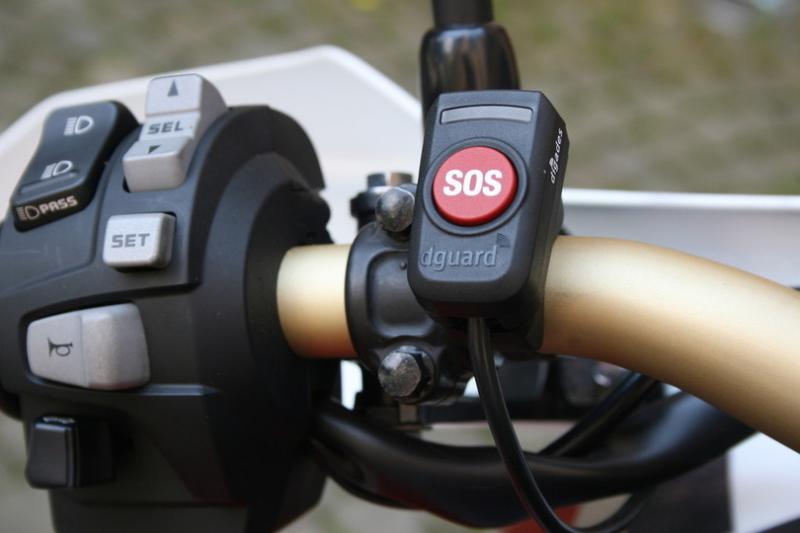 A dguard® rendelkezik célszerűen kormányszarvra erősített kézi SOS gombbal is. Ezt akár a baleset helyszínén lévő szemtanú is megnyomhatja.