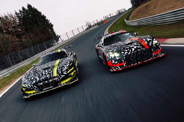 A GT3 (sárga) és közúti ikertestvérének (piros) párhuzamos fejlesztése lehetővé teszi az AMG számára, hogy közvetlenebbül vigye át az utcai modellbe a versenypályáról levont tanulságokat, különösen olyan területeken, mint az aerodinamika, a hűtés és a futóműbeállítás.