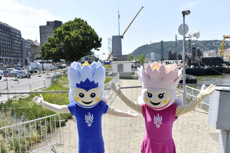 Water Lali és Water Lili, a 2017-es budapesti FINA vizes világbajnokság kabalafigurái a megnyitó ünnepségének helyszínén, a Jane Haining rakparton 2017. június 28-án. Fotó: Illyés Tibor/MTI