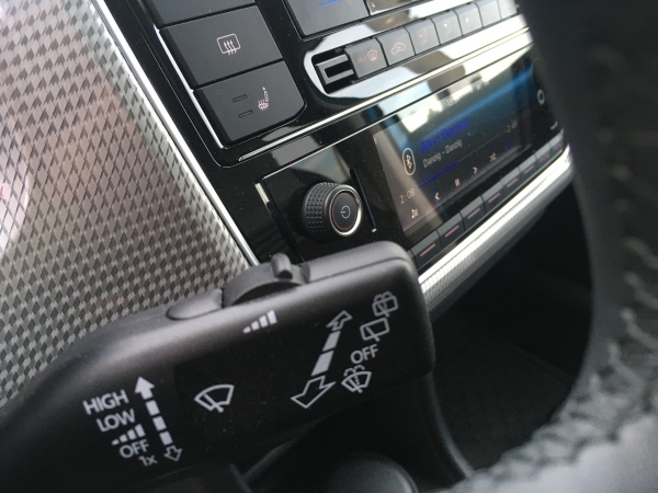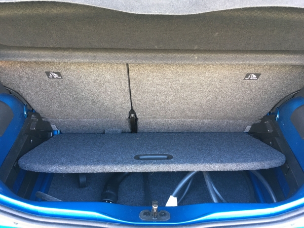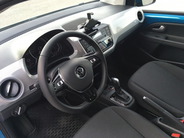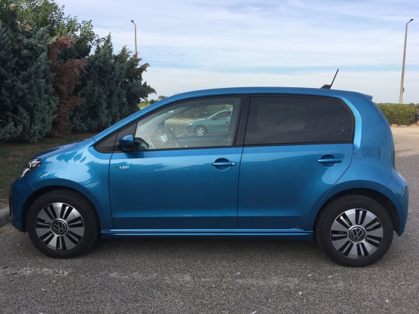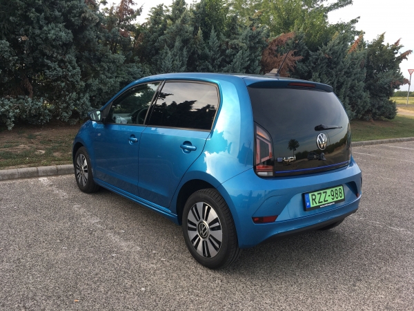 Sokat nem módosult elődjéhez képest a 3,6 méter hosszú (tengelytávja 2,42 méter), Pozsonyban gyártott Volkswagen e-Up!, de ami megújult (orrész, LED-es nappali fények, külső tükrökbe épített irányjelző), az elnyerte a tetszésemet. Belül áttekinthető, világos, modern. Praktikus, minimalista, ugyanakkor cuki és vagány. A tartozékként kapható USB-s mobiltelefon-tartó jó szolgálatot tesz, ezen keresztül lehet tölteni csak a telefonunkat. A tükrözésre azonban Bluetooth-on is képes, így a Spotify vígan megy rajta, letöltött maps and more alkalmazással pedig digitális műszerfalat is kaphatunk. Vicces a tolatókamera, amelynek képátlója kb. 3 centiméter. Apró, de hasznos, bár, ez a kicsi autó igazán jól átlátható manőverezés közben. Csomagtartója szerény, 251 literes (bővítve 959 literes). Álpadlóval majdnem teljesen sík felületet kapunk, alatta elférnek a töltőkábelek.