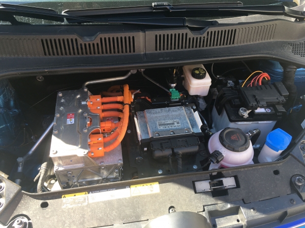 A bruttó 36,8, nettó 32,3 kWh kapacitású akkumulátorának helyigénye ugyanakkora, mint az elődé, csupán 15 kilogrammal nehezebb. A Magyarországon gyártott teljesítmény-elektronikával (Bosch), kábellel, akkuval és villanymotorral együtt a hajtáslánc 250 kilogrammot nyom a mérlegen, az e-Up! saját tömege 1160 kilogramm. Ehhez társul a jó légellenállás, Cw értéke 0,31. A 14 modulból álló akkumulátort két blokkra osztották, amelyeket az első és a hátsó ülések alatt helyeztek el.