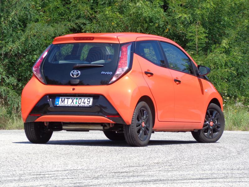 Formailag sokkal jobban elkülönül az Aygo a francia testvéreitől, mint korábban, szinte minden karosszériaeleme egyedi. Hossza 25 mm-t nőtt, a magassága 7 mm-t csökkent, a tengelytáv változatlan. Legjellegzetesebb része az orrán uralkodó hatalmas X motívum, amely az első sárvédőkön és a hátsó lökhárítón található betéthez hasonlóan kipattintható és cserélhető, akár egy mobiltelefon előlapja. Kevesen várták, hogy a hármasikrek közül pont a Toyota kapja majd meg a legbátrabb formatervet, hiszen a japán gyártó nem épp az izgalmas formáiról híres, de ezúttal mégis egy olyan, japán képregények által inspirált dizájnnal álltak elő, amit csak szeretni vagy utálni lehet. Emlékeim szerint még sosem néztek meg ennyien egy miniautót, mint az együtt töltött egy hét alatt az Aygót, de elég nehéz lemérni, hogy erről a narancsszínű fényezés, vagy pedig a forma tehetett. Nem kérdés, hogy az új Aygo jóval sportosabbnak tűnik elődjénél, amiről a 15 colosra növelt kerekek és a meredekebben emelkedő övvonal tehet. Ügyesen integrálták az X motívumba a csinos fényszórókat és a skorpiófarkat mintázó hátsó lámpákat, a szélvédő előretolásával a kocsi súlypontja is kissé előrébb került.