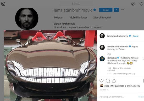 A fotó azt a pillanatot örökíti meg, amikor Ibra először áll be a garázsába az egyedi festésű új szerzeménnyel, egy exkluzív Ferrari Monza SP2-vel, amelyet a Los Angeles Galaxy labdarúgója saját ízlésére alakíttatott. Az autó külseje fekete, a belső tér színe, illetve a két ülés pedig piros. A fotó mellé odaírta: "Boldog születésnapot Zlatan!"