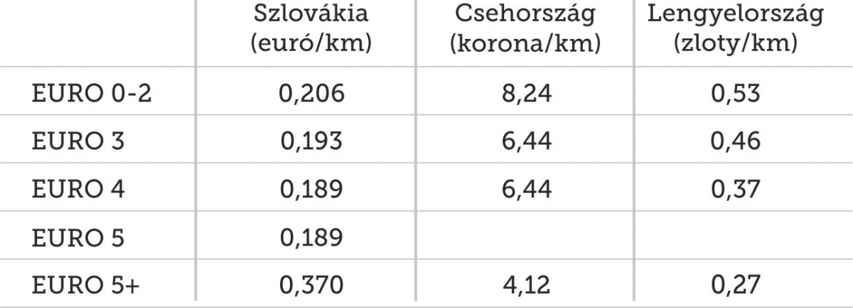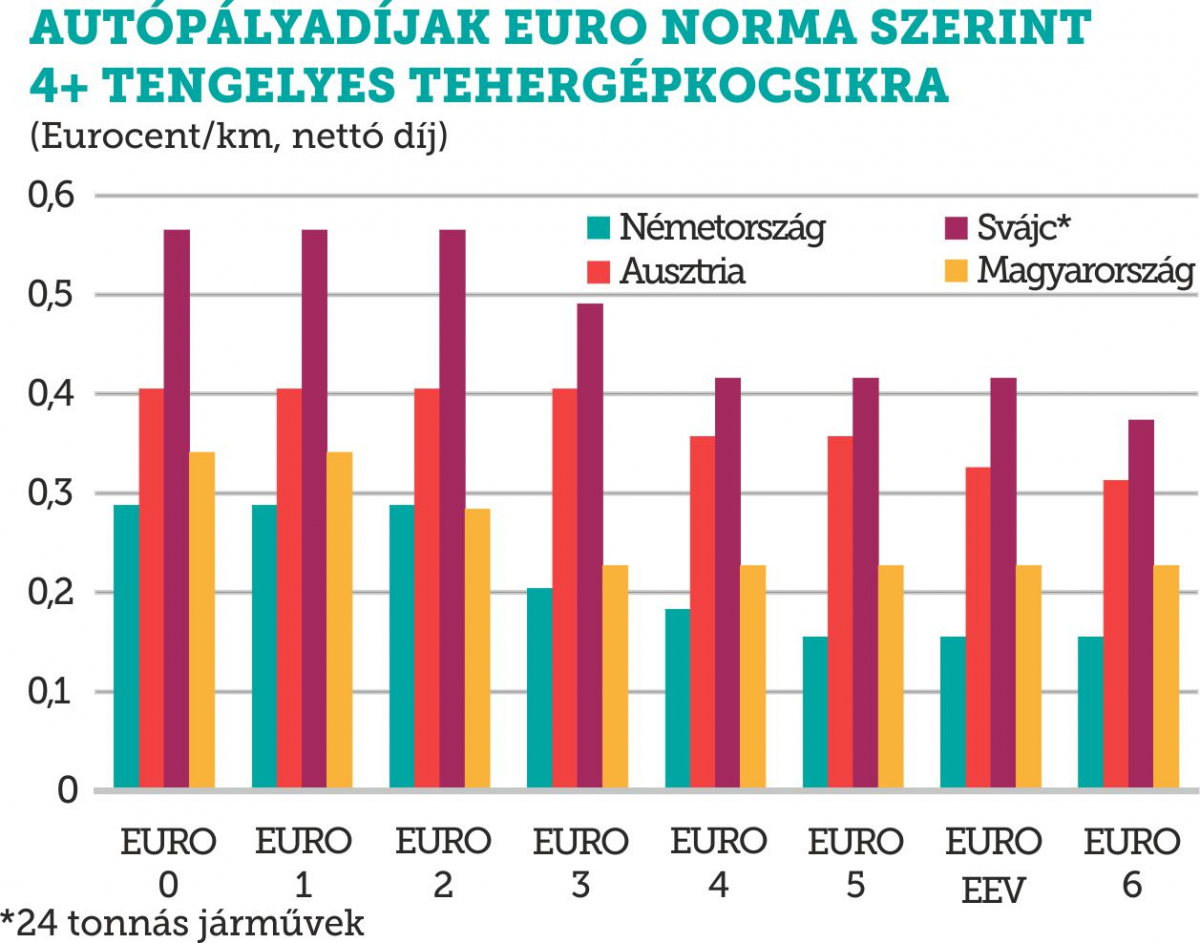 Amíg Magyarországon az EURO 3-tól EURO 6-ig terjedő kategóriába tartozó járművek után ugyanannyit kell fizetni kilométerenként, addig a másik három vizsgált országban ezt a tartományt is erősen tagolják. Az EURO 0-tól az EURO 6-ig (illetve EURO EEV) terjedő besorolásban a négynél több tengelyes teherjárművek úthasználata után fizetendő díj, fokozatosan csökken a környezetkímélőbb megoldást használó kamionok felé haladva. Így például Ausztriában összesen négy díjkategória létezik EURO 3 és EURO 6 között, de hasonló a helyzet Lengyelországban is, valamint a többi visegrádi ország is előrébb jár ebben Magyarországhoz képest, nemcsak a nyugat-európai országok.